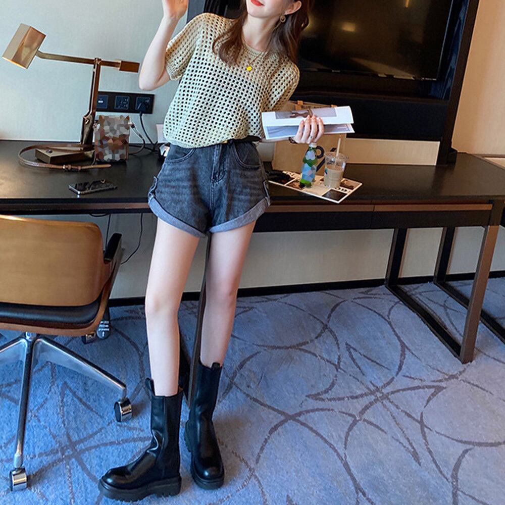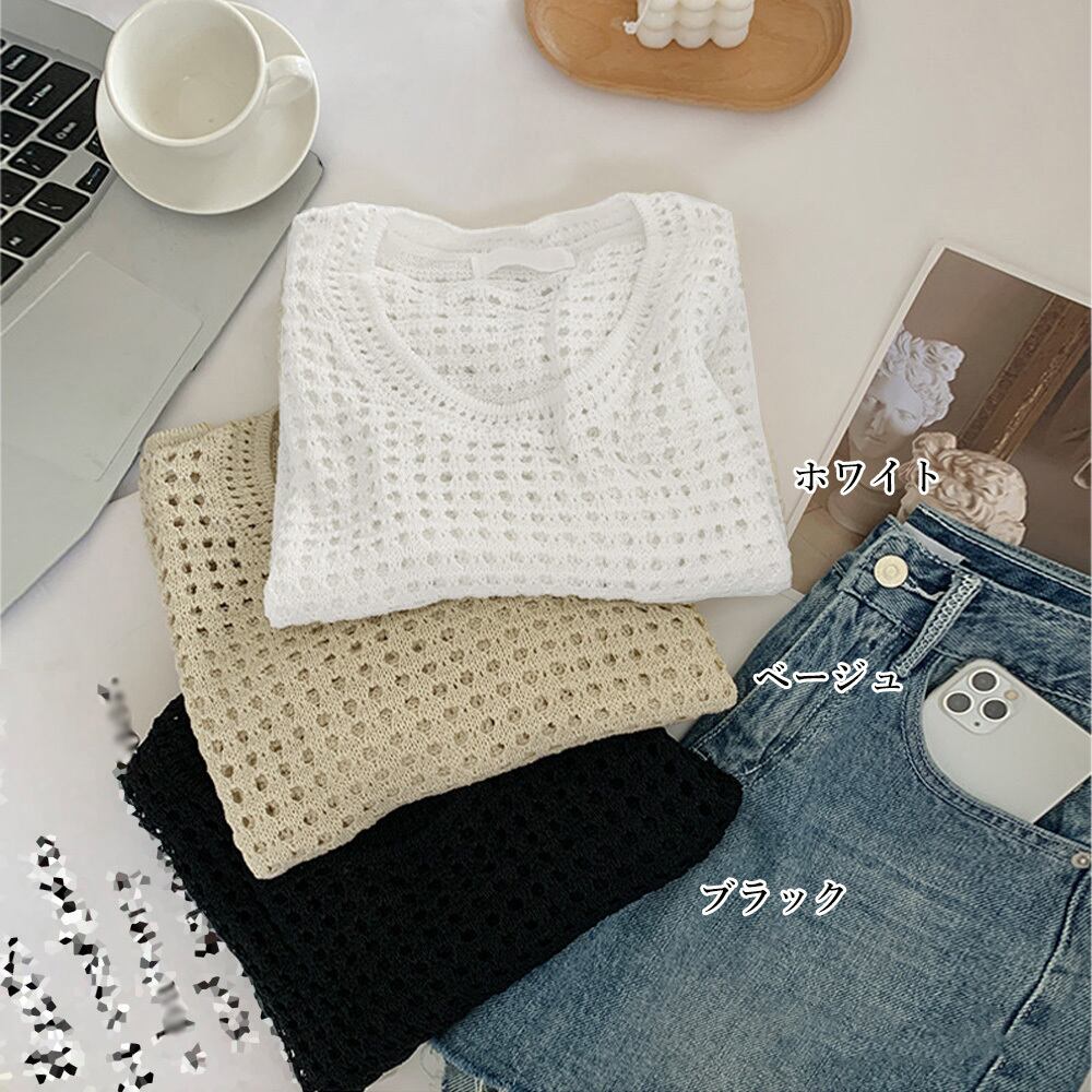 穴あき ショート丈トップス 無地クルーネック 透かし編みニットプルオーバー 春夏秋 透け感 おしゃれ きれいめカジュアル